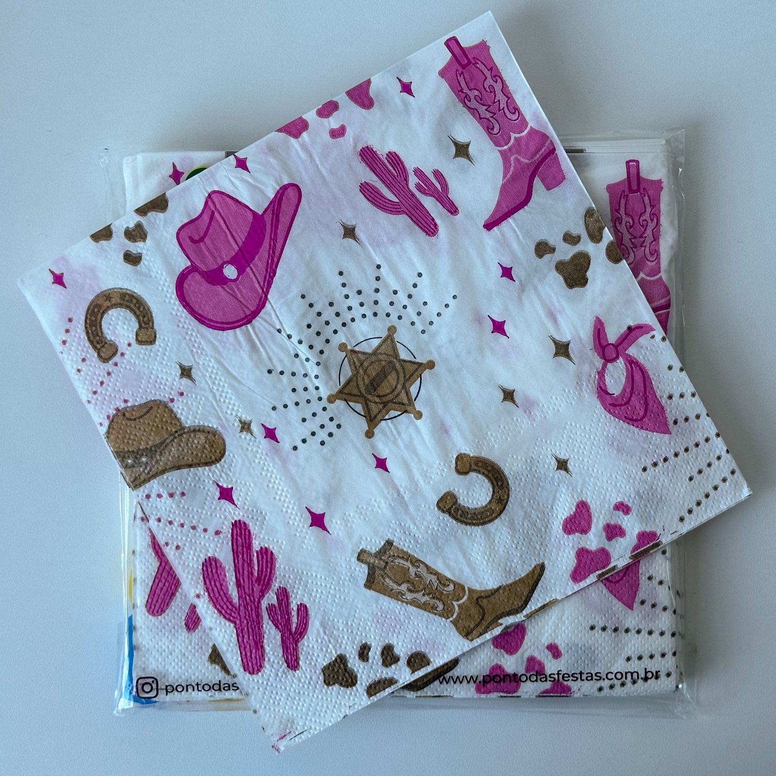 Leve o clima do faroeste para sua festa! Guardanapos descartáveis com estampa country em tons de rosa e marrom, perfeitos para festas temáticas, aniversários e eventos divertidos.