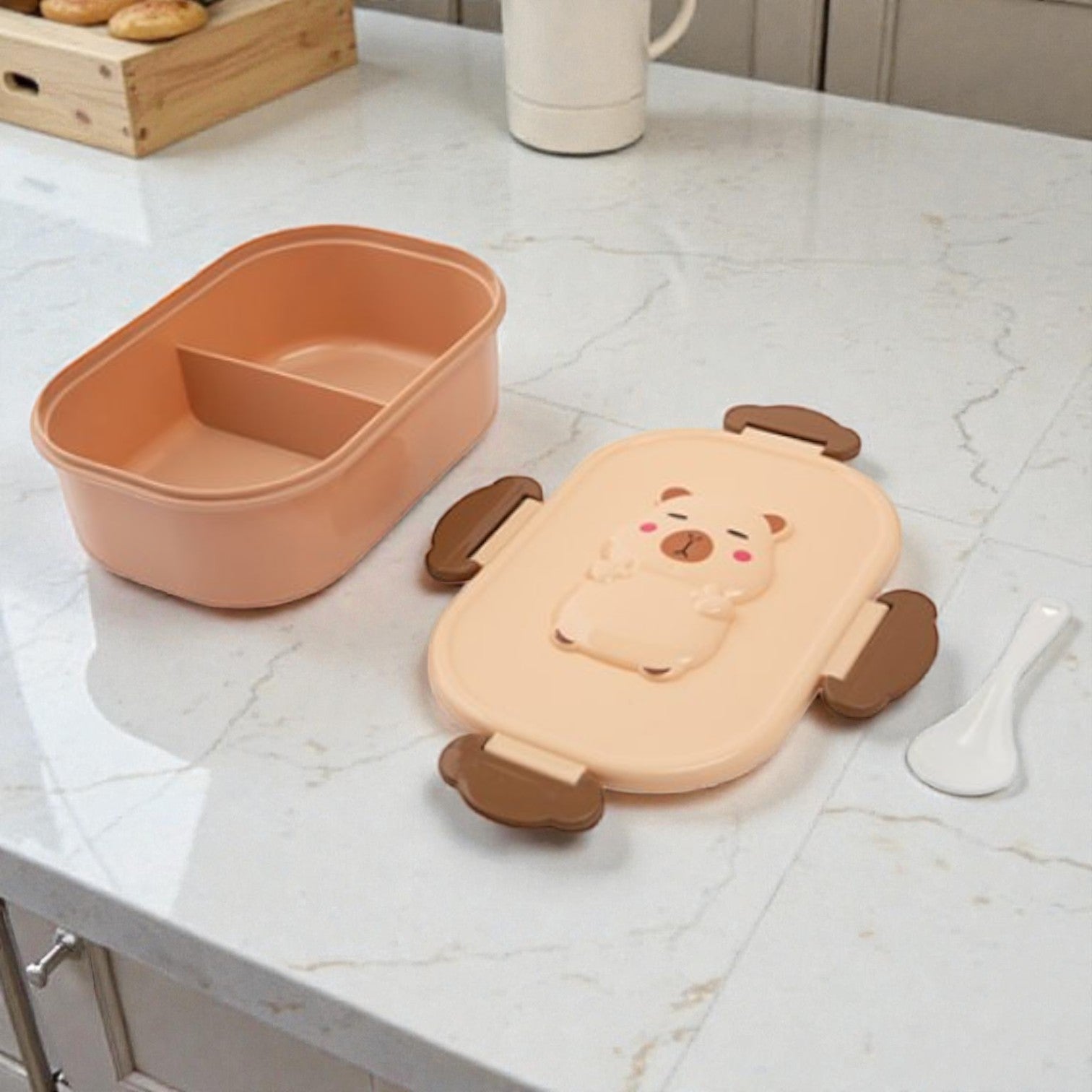 Possui divisória interna e acompanha talher, facilitando o dia a dia da lancheira escolar, passeios ou uso em casa.