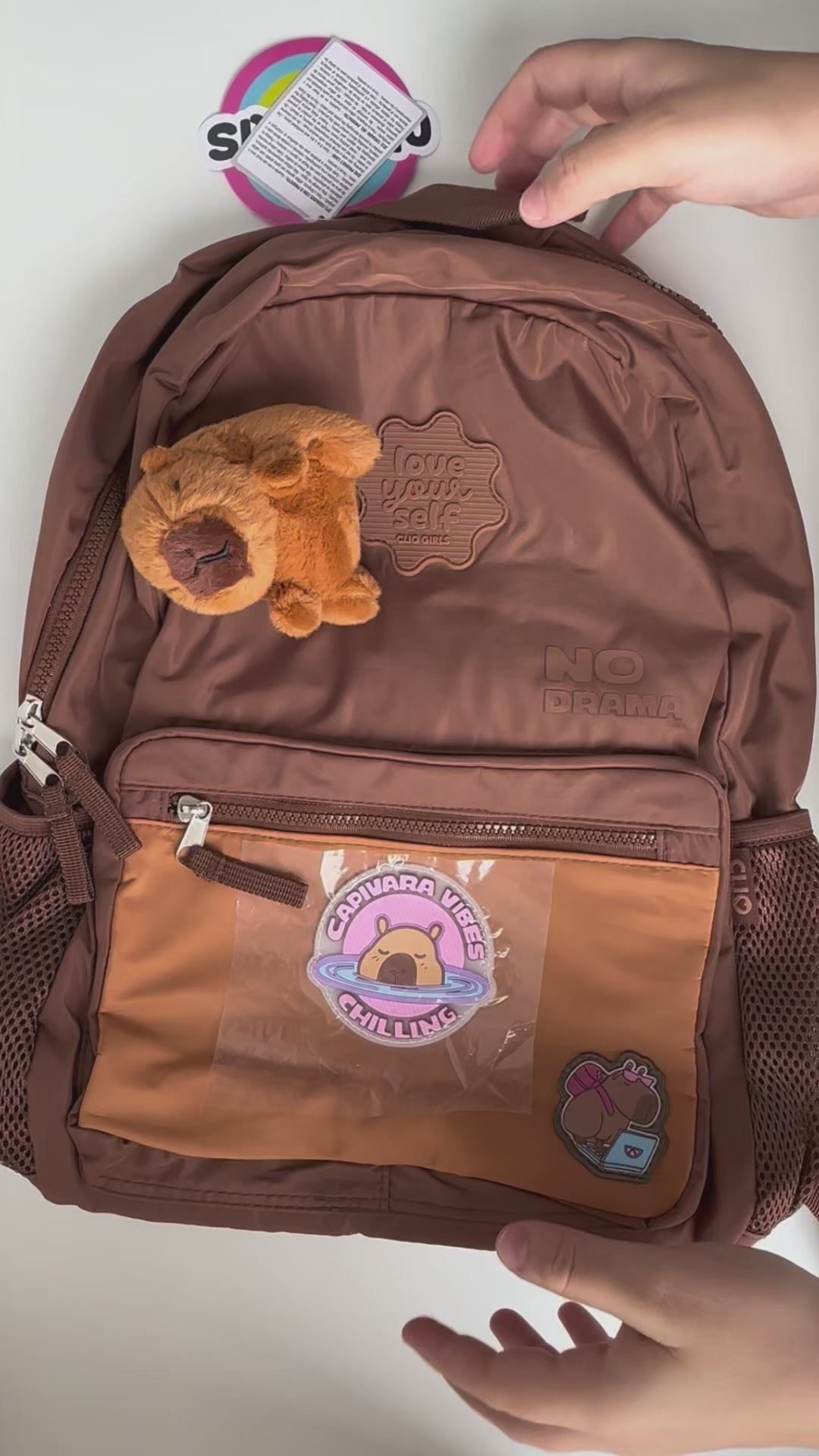 Com design moderno em tom terroso e patches divertidos de capivara, ela transmite uma vibe leve, urbana e atual — perfeita para escola, passeios ou atividades do dia a dia.